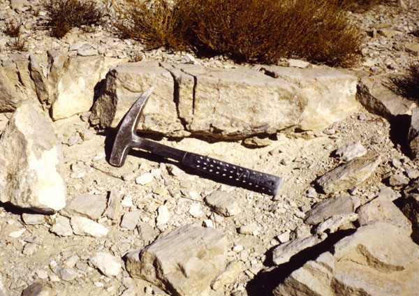 Exposure of Lawlor Tuff near top of Member Two. Rock hammer for scale.