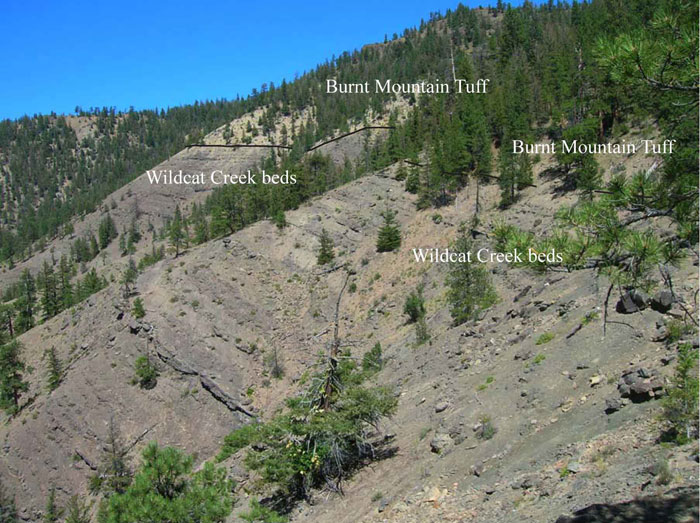 FIGURE 15. Contact between the upper Wildcat Creek beds and the overlying Burnt Mountain Tuff in the Thunder Creek drainage.