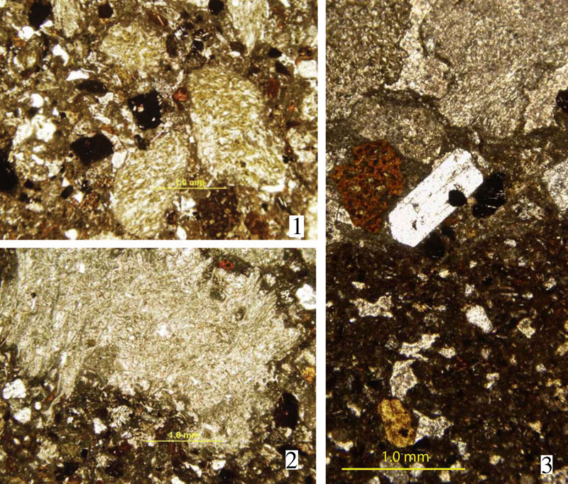 Pumice lapilli fragments in thin section (1 and 2), and in a reverse graded bed (3).